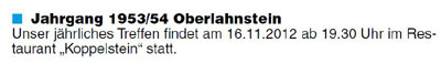 nicht mehr unter uns weilen. Mein Vorschlag eine Gruppe (Jahrgang 53/54 Oberlahnstein) bei Facebook zu bilden wurde hingegen so gut wie einstimmig abgelehnt - so modern wollen wir dann doch nicht sein. Ein wenig schade ist das schon da ja niemand dieser Gruppe beitreten muss der dies nicht möchte und es gut für einen Austausch gewesen wäre. Wie all die Jahre vorher war es auf jeden Fall für alle wieder ein schöner Abend mit netten Gesprächen, gutem Essen um gepflegten Getränken. Um 23:15 Uhr brachen dann die letzten auf, unser sogenannter "Harter Kern". Und wie zuvor beende ich diesen kleinen Bericht mit dem berühmten Satz: Wie sich die Zeiten doch ändern, in viel früheren Jahren sind wir noch durchs Städtchen gezogen und so mancher kam erst im Morgengrauen wieder nach Hause.... So Gott will treffen wir uns alle im nächsten Jahr wieder und ich denke jeder/jede freut sich darauf. |