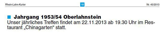 Ab 19:30 Uhr am 22.November 2013 fand unser jährliches Novembertreffen, zum ersten Mal im "Chinagarten", statt bei dem die gute Laune und die Freude am Widersehen wie jedes Jahr regierte. Obwohl es am Anfang noch hieß es hätten sich wenig angemeldet füllte sich unser Tisch doch sehr schnell und zum Schluss war es eben nur eine Person weniger als im Vorjahr. Wir hatten zahlreiche Gesprächsthemen und es war ein harmonischer Abend in unserem gut gefüllten Chinarestaurant welches über die Stadtgrenzen hinaus für seine schöne Atmosphäre und sein gutes Essen bekannt ist.